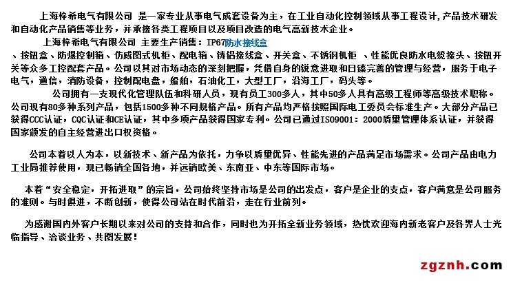 • 主營行業(yè)防水密封箱 端子接線盒 按鈕盒 玻璃纖維箱 聚酯防爆接線盒 鑄鋁盒 不銹鋼碳鋼機箱