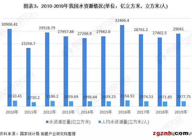 2010-2019年,我國(guó)水資源總量整體呈現(xiàn)小幅波動(dòng)變化的趨勢(shì),2011年,我國(guó)水資源總量為23256.7億立方米,為近年最低值,2016年,我國(guó)水資源總量為32466.4億立方米,為近年最高值;與此同時(shí),人均水資源量也處于不穩(wěn)定狀態(tài),2019年為2051.21立方米/人。