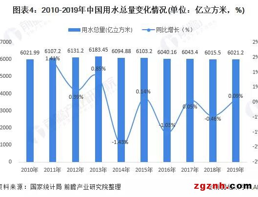 我國(guó)用水總量在2013年達(dá)到峰值,近幾年,全國(guó)用水總量保持基本穩(wěn)定,平均年變化幅度保持在±1%左右。2019年我國(guó)用水總量為6021.2億立方米,同比增長(zhǎng)0.09%,全國(guó)用水總量比2018年略有增加,用水效率進(jìn)一步提升,用水結(jié)構(gòu)不斷優(yōu)化。