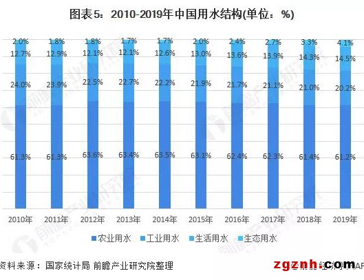 從需求結(jié)構(gòu)看,農(nóng)業(yè)用水一直是用水需求最大的產(chǎn)業(yè),占比超過(guò)60%。其次是工業(yè)用水,需求占比在20%以上,第三用水需求是生活用水,最后為生態(tài)用水。