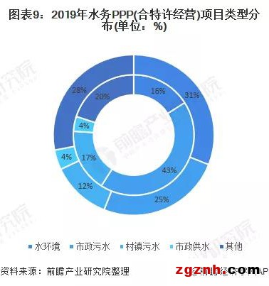 2019年,水務(wù)PPP(合特許經(jīng)營(yíng))中標(biāo)項(xiàng)目數(shù)量超過(guò)400個(gè),投資額近3000億。從項(xiàng)目數(shù)量分布上看,市政污水處理特許經(jīng)營(yíng)占主要部分,占比43%;從項(xiàng)目金額分布上看,水環(huán)境PPP占比最大,占比31%。