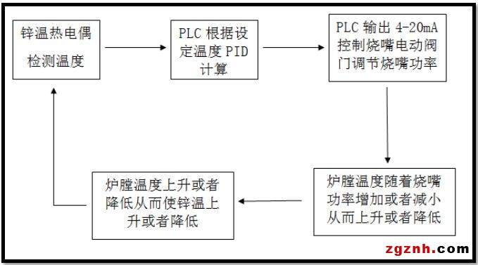 熱鍍鋅爐設備如圖1,圖2所示,設備分為加熱區(qū)和熱鍍鋅區(qū)兩個區(qū)域,加熱區(qū)由加熱罩以及燒嘴1#和燒嘴2#組成,燒嘴1#和燒嘴2#為兩個天燃氣燒嘴,通過燒嘴電動閥控制燒嘴的功率大小,電動閥的信號為直流4-20mA信號。溫度控制原理如圖3所示;鋅溫熱電偶采集實時鋅溫信號,將信號反饋給PLC,PLC根據(jù)設定鋅溫通過PID計算輸出4-20mA信號驅動燒嘴電動閥調節(jié)燒嘴的功率來升高或者降低加熱區(qū)的爐膛溫度,使得實際鋅溫穩(wěn)定在設定鋅溫值。