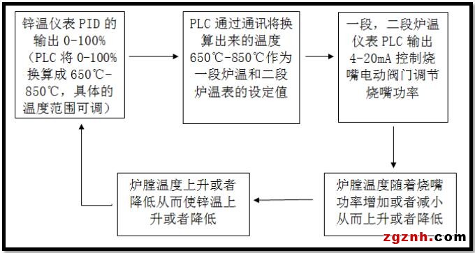 設備改進后的工作原理如圖6所示,鋅溫儀表根據(jù)實際鋅溫和設定鋅溫PID運算,儀表的輸出0%-100%,PLC通過儀表的標準Modbus通訊功能讀取儀表的輸出0%-100%,通過程序將0%-100%換算為650℃-850℃(這個溫度范圍為現(xiàn)場調試后總結的經(jīng)驗數(shù)據(jù))計算得出的這個溫度就作為一段和二段爐膛溫度控制儀表的設定值,這里再次運用到儀表的標準Modbus通訊功能,通過通訊的寫功能自動的將設定溫度寫入儀表,從而使得一段,二段爐膛溫度控制儀表的設定溫度會根據(jù)鋅溫變化隨之變化,而且這種變化是很線性的,不存在跳變。爐溫升高或者降低使得鋅溫也得到變化,鋅溫熱電偶檢測到實時鋅溫在進行PID計算從而調節(jié)爐溫的設定值,從而實現(xiàn)一個閉環(huán)控制。