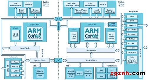 系統(tǒng)控制單元(一般是MCU、DSP或FPGA的組合)必須能并行運(yùn)行多個(gè)高速控制環(huán)路,還要能管理安全特性。它們必須提供冗余性以及大量獨(dú)立的PWM信號(hào)、ADC和I/O。ADI的ADSP-CM419F使設(shè)計(jì)師可以用一個(gè)混合信號(hào)雙核處理器同時(shí)管理高功率、高密度、混合開關(guān)、多層功率轉(zhuǎn)換系統(tǒng)。
