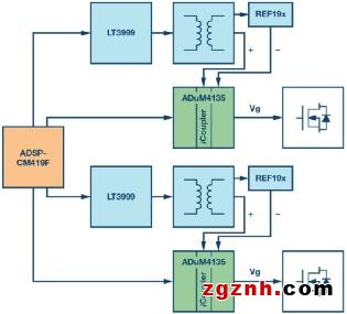在圖9中,我們可以看到功率開關(guān)驅(qū)動(dòng)器中的主要元件,從產(chǎn)生正柵極電壓電平的LT3999DC-DC變壓器驅(qū)動(dòng)器,到產(chǎn)生負(fù)柵極電壓電平的REF19x(或LT1121x)高效線性穩(wěn)壓器,再到ADuM4135隔離式柵極驅(qū)動(dòng)器。主控制器用ADSP-CM419F處理器表示,可以嵌入電路板,也可連接高頻線纜并為隔離式柵極驅(qū)動(dòng)器生成PWM信號(hào)。