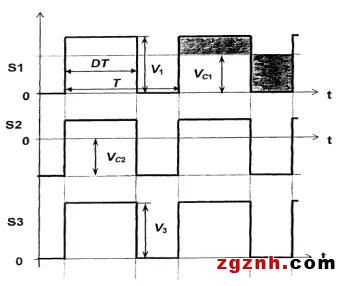 其中,電容C1為輸入端直流隔離電容,C3為開關(guān)管QM等效的輸入電容。電容電壓的參考方向如圖1所示,T1為磁隔離驅(qū)動變壓器。S1是脈沖寬度調(diào)制驅(qū)動器(PWM Driver)的輸出信號波形,S2是變壓器輸入端的波形,S2是該磁隔離驅(qū)動器的輸出波形。圖1所示的電路工作波形如圖2所示。