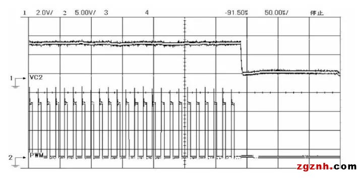 為了解決圖3中雙隔直磁隔離驅(qū)動電路的誤導(dǎo)通問題,金升陽公司針對次級隔直電容C2做了特殊放電電路。如圖6所示,其中添加了原邊檢測電路和次級隔直電容放電電路,該電路為金升陽公司自主發(fā)明專利電路。通過高速光耦做信號隔離,有效解決主功率開關(guān)管誤導(dǎo)通的問題,改進后的驅(qū)動波形如圖7中2通道PWM波形所示,可以看出在驅(qū)動異常關(guān)閉狀態(tài)下,C2上的電壓迅速放電完成,開關(guān)管不會出現(xiàn)異常開通狀態(tài)。為金升陽公司超高超寬壓輸入系列產(chǎn)品提供高可靠的驅(qū)動,提升產(chǎn)品綜合競爭力。
