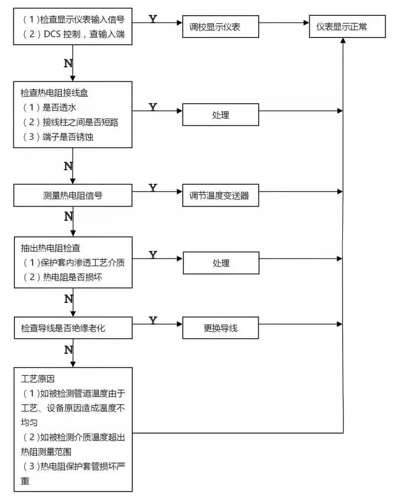 因為是正常生產(chǎn)中的故障,不是新安裝的熱電阻,是用可以排除熱阻線極接反。排除上述因素后可以按下圖的思路進行判斷和檢查。