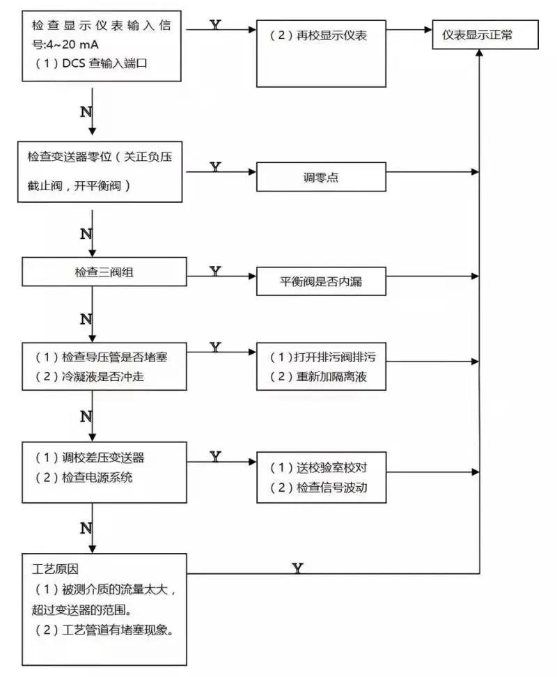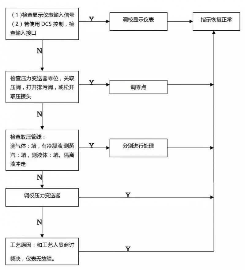 首先應(yīng)了解被測介質(zhì)是氣體還是液體,了解工藝開車情況和簡單工藝流程,根據(jù)對工藝情況的了解和儀表故障現(xiàn)象來進行儀表故障判斷和處理。有關(guān)故障判斷及處理科按下圖的思路來進行檢查。