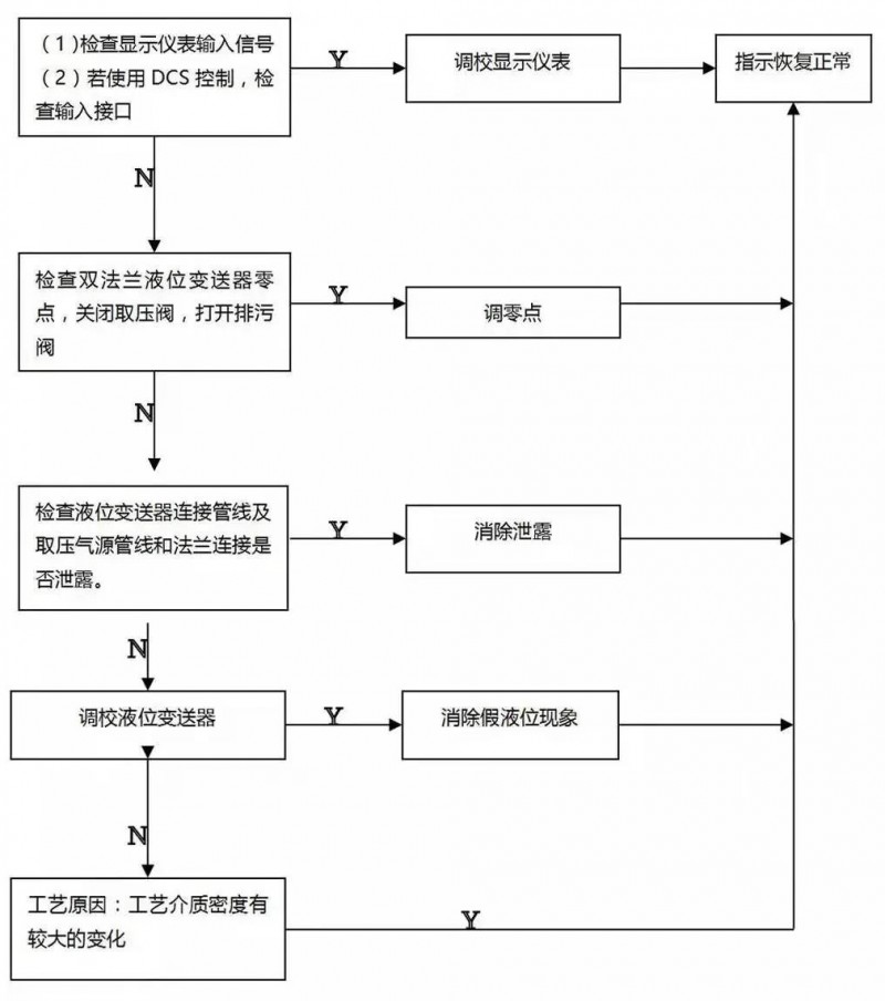 而儀表維護人員應(yīng)根據(jù)工藝狀況或儀表故障現(xiàn)象進行判斷或檢查。有關(guān)液位(物位)檢測故障判斷思路可以參照下圖進行。