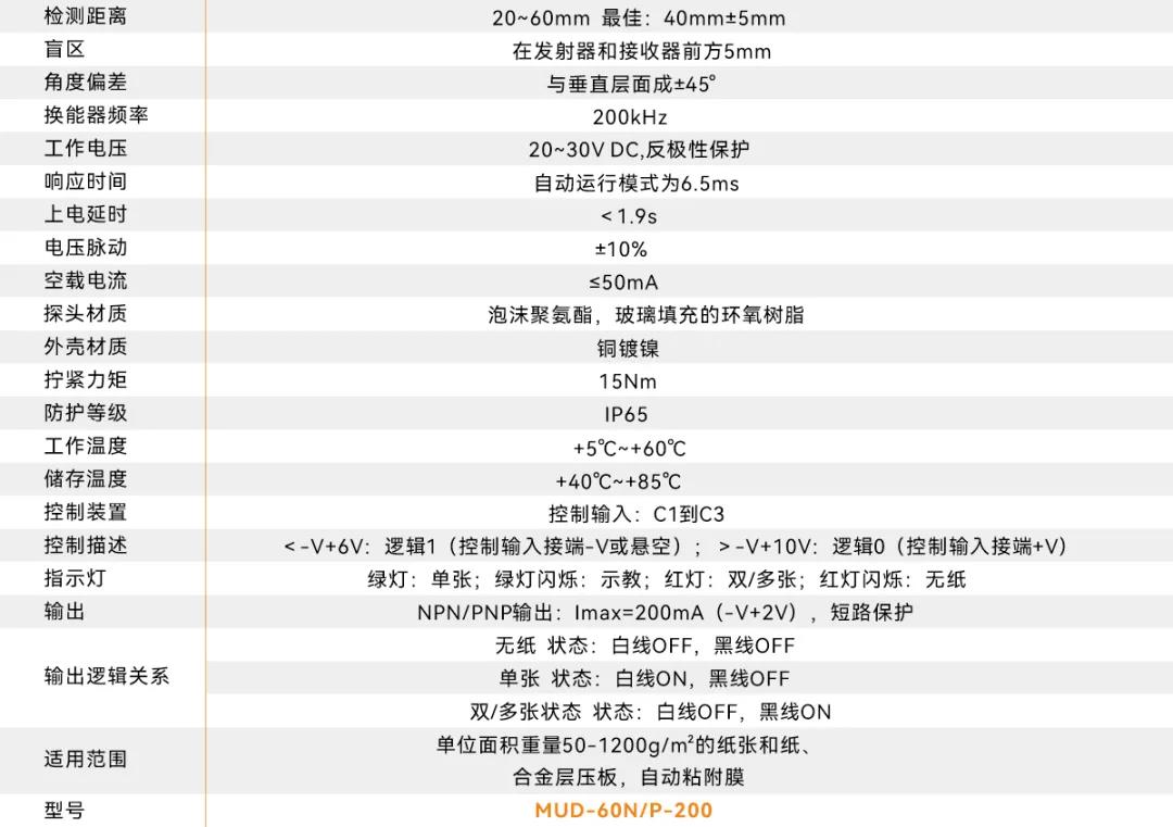 使用明治MUD-60N/P-200,主要原理是利用超高頻的超聲波發(fā)射器從薄片下方發(fā)送超聲波波束,聲波使薄片振動(dòng),而這也會(huì)在薄片另一邊產(chǎn)生一束非常小的聲波,被超聲波接收器接收到,當(dāng)信號(hào)透過兩層薄片(雙張)時(shí)會(huì)變得非常弱,無法到達(dá)接收器,傳感器在識(shí)別到異常時(shí)可以給設(shè)備發(fā)送異常信號(hào),從而保障切割刀片不受損傷、物料也不會(huì)因此被浪費(fèi)。