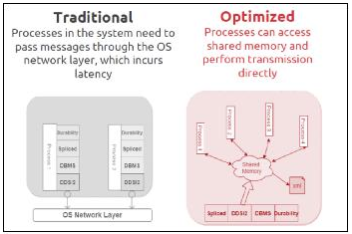 ●為了優(yōu)化數(shù)據(jù)的內(nèi)部處理,需要考慮系統(tǒng)是否具有共享內(nèi)存的機(jī)制(見圖3)。在傳統(tǒng)的實(shí)現(xiàn)方法中,系統(tǒng)中的進(jìn)程需要透過操作系統(tǒng)網(wǎng)絡(luò)層傳遞消息,這樣就會(huì)導(dǎo)致延遲的現(xiàn)象。訪問共享內(nèi)存并直接執(zhí)行傳輸是一種經(jīng)過優(yōu)化的解決方法,可以顯著降低延遲。