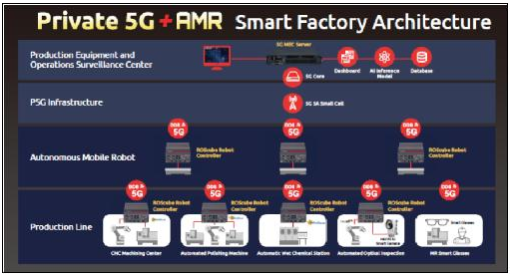 第一次實(shí)施機(jī)群自治是在友嘉集團(tuán)的巖田友嘉精機(jī)工廠的工業(yè)級(jí)噴槍生產(chǎn)線上,該工廠位于臺(tái)灣新竹縣湖口鎮(zhèn)。生產(chǎn)設(shè)備和運(yùn)營監(jiān)控中心與5G專網(wǎng)和DDS進(jìn)行了實(shí)時(shí)的整合,并與生產(chǎn)線信息集成,通過連接到AMR,將零部件運(yùn)送到多個(gè)檢測部門以提高生產(chǎn)力(見圖5)。