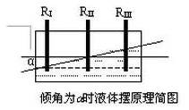 當(dāng)玻璃殼體傾斜時(shí),電極間的導(dǎo)電液不相等,三根電極浸入液體的深度也發(fā)生變化,但中間電極浸入深度基本保持不變。如圖所示,左邊電極浸入深度小,則導(dǎo)電液減少,導(dǎo)電的離子數(shù)減少,電阻RI增大,相對(duì)極則導(dǎo)電液增加,導(dǎo)電的離子數(shù)增加,而使電阻RIII 減少,即RI>RIII。反之,若傾斜方向相反,則RI<RIII。
