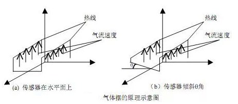 氣體擺式檢測(cè)器件的核心敏感元件為熱線。電流流過熱線,熱線產(chǎn)生熱量,使熱線保持一定的溫度。熱線的溫度高于它周圍氣體的溫度,動(dòng)能增加,所以氣體向上流動(dòng)。在平衡狀態(tài)時(shí),如圖4(a)所示,熱線處于同一水平面上,上升氣流穿過它們的速度相同,即V1=V1′,這時(shí),氣流對(duì)熱線的影響相同,由式(7)可知,流過熱線的電流也相同,電橋平衡。當(dāng)密閉腔體傾斜時(shí),熱線相對(duì)水平面的高度發(fā)生了變化,如圖4(b)所示,因?yàn)槊荛]腔體中氣體的流動(dòng)是連續(xù)的,所以熱氣流在向上運(yùn)動(dòng)的過程中,依次經(jīng)過下部和上部的熱線。若忽略氣體上升過程中克服重力的能量損失,則穿過上部熱線的氣流已經(jīng)與下部熱線的產(chǎn)生熱交換,使穿過兩根熱線時(shí)的氣流速度不同,這時(shí)V2¢>V2,因此流過兩根熱線的電流也會(huì)發(fā)生相應(yīng)的變化,所以電橋失去平衡,輸出一個(gè)電信號(hào)。傾斜角度不同,輸出的電信號(hào)也不同。