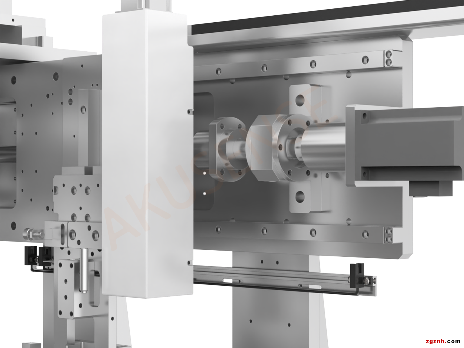 料盒從傳輸線上過來后到達(dá)上料工位,馬達(dá)動(dòng)作上頂料盒治具到預(yù)定位置,此過程中,接近開關(guān)控制上頂機(jī)構(gòu)的原點(diǎn)和極限位置。
