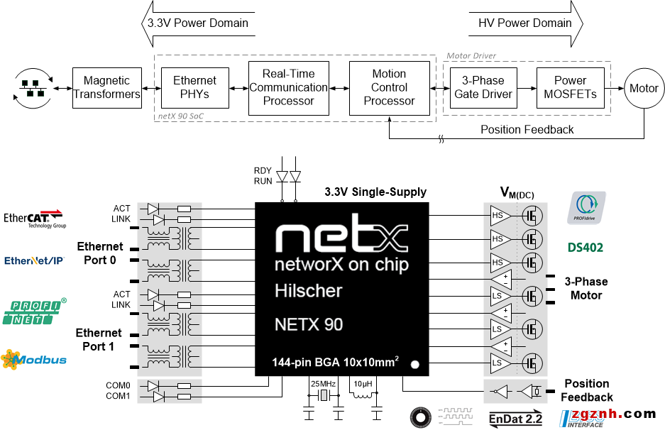 netMOTION有效地將實時以太網(wǎng)轉(zhuǎn)變?yōu)檫\動控制解決方案,它被認為是全球市場上具有與實時以太網(wǎng)通訊集成的運動控制功能的微控制器,涵蓋了多種網(wǎng)絡協(xié)議標準的廣度和深度。通過赫優(yōu)訊在實時通訊方面的專業(yè)知識與芯片的應用能力相結合,netMOTION將兩個獨立的世界整合為一個。單芯片解決方案的好處包括更低的延遲、更高的效率、改進的同步功能和更短的周期時間,還可以降低材料成本,并且可以更快地將設計推向市場。netMOTION支持節(jié)能概念,可為基于FOC的電機控制提供確定性、低延遲、網(wǎng)絡同步的解決方案。它適用于三相PMSM(永磁)和BLDC(無刷直流)電機的霍爾、編碼器或旋轉(zhuǎn)變壓器位置反饋。netMOTION的目標應用是需要集中運動控制的系統(tǒng)或機器,例如泵、風扇、壓縮機、閥島、小型執(zhí)行器和編碼器,以及具有網(wǎng)絡接口的伺服電機。在網(wǎng)絡方面,赫優(yōu)訊的通訊固件產(chǎn)品已做好準備,支持EtherNet/IP的CIP Sync、EtherCAT、CANO??pen DS402的CoE、SERCOS的SoE和PROFIdrive的PROFINET RT/IRT等功能。