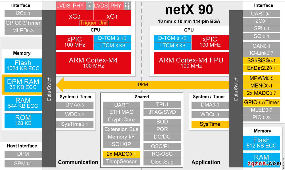 netX 90芯片包含兩個Arm® Cortex®-M4處理器內(nèi)核,一個專用于網(wǎng)絡通訊,另一個用于應用程序。這兩個部分是隔離的,因此網(wǎng)絡上的攻擊無法到達應用程序。網(wǎng)絡協(xié)議由可加載固件定義,支持19種不同的協(xié)議,意味著一種產(chǎn)品設計可以滿足多種市場和行業(yè)需求。嵌入式安全功能包括安全啟動、安全更新和安全通訊。基于(D)TLS 的通訊協(xié)議的硬件加速器確保它可以建立平滑、安全的互連。芯片的每一半都有自己的外圍連接,左側(cè)是實時通訊(也集??成了PHY),右側(cè)是用于各種運動控制應用的一系列軟件定義接口。