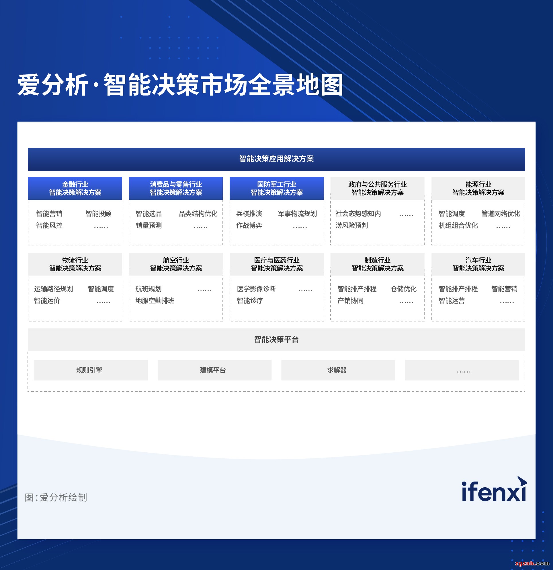 從技術(shù)架構(gòu)角度,智能決策市場可以劃分為智能決策平臺和智能決策應(yīng)用解決方案兩部分市場。智能決策平臺提供支撐智能決策算法、模型和應(yīng)用開發(fā)及計算的工具。應(yīng)用解決方案層重點包括金融、消費品與零售、國防軍工、政府與公共服務(wù)、制造、能源、物流、航空、醫(yī)療與醫(yī)藥、汽車等行業(yè)智能決策解決方案。