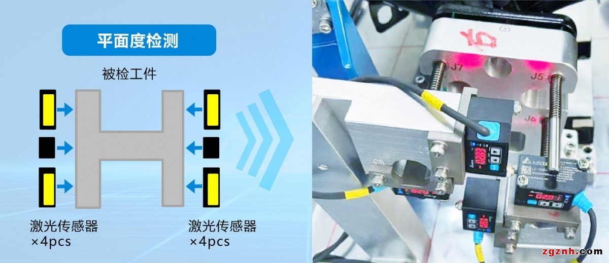 平面度檢測(cè):用于汽配設(shè)備,使用多顆激光傳感器同時(shí)測(cè)量被檢工件的不同點(diǎn)位置,通過對(duì)應(yīng)點(diǎn)的距離差值判斷工件平面度是否達(dá)標(biāo)。