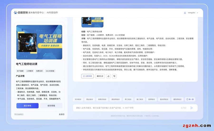網(wǎng)站內(nèi)容鋪設(shè)過(guò)程繁瑣,卻不容忽視,因而內(nèi)容生產(chǎn)能力尤為重要,「AI內(nèi)容創(chuàng)作AI問(wèn)答/產(chǎn)品生成」功能的上線,讓商家建站實(shí)現(xiàn)內(nèi)容生產(chǎn)效率和創(chuàng)作質(zhì)量雙向提升。以電工培訓(xùn)類(lèi)商家建站為例,商家打開(kāi)基木魚(yú)內(nèi)容中心,進(jìn)入AI內(nèi)容創(chuàng)作界面,簡(jiǎn)單輸入“電工培訓(xùn)”關(guān)鍵詞,即可秒級(jí)生成相關(guān)問(wèn)題、答案或產(chǎn)品詳情介紹等內(nèi)容。「AI內(nèi)容創(chuàng)作AI問(wèn)答/產(chǎn)品生成」功能在內(nèi)容生產(chǎn)前-中-后全流程助力商家簡(jiǎn)單便捷地創(chuàng)作內(nèi)容,相比人工時(shí)間縮短了近百倍,大幅了降低生產(chǎn)成本。此外,通過(guò)AIGC能力訓(xùn)練模型學(xué)習(xí)質(zhì)量評(píng)估標(biāo)準(zhǔn),在內(nèi)容生產(chǎn)階段大幅提升內(nèi)容審核通過(guò)率以及內(nèi)容優(yōu)質(zhì)度和豐富性。