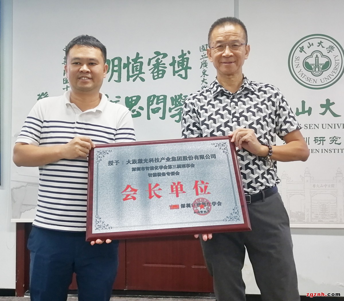會上李會長為中山大學(xué)深圳研究院頒發(fā)“產(chǎn)學(xué)研合作專委會會長單位”牌匾,為大族激光科技產(chǎn)業(yè)集團(tuán)股份有限公司頒發(fā) “智能裝備專業(yè)委員會會長單位” 牌匾。