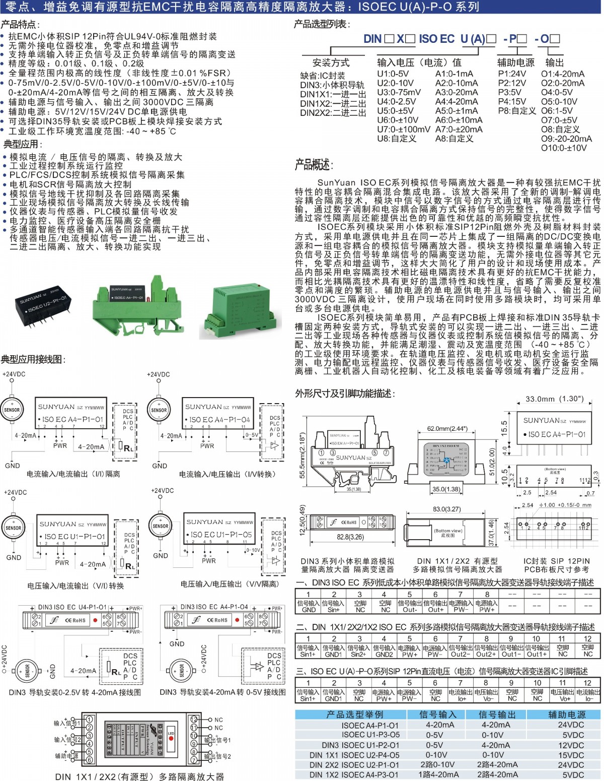 ISO EC系列模塊簡(jiǎn)單易用,產(chǎn)品有PCB板上焊接和標(biāo)準(zhǔn)DIN 35導(dǎo)軌卡槽固定兩種安裝方式,導(dǎo)軌式安裝的可以實(shí)現(xiàn)一進(jìn)二出、一進(jìn)三出、二進(jìn)二出等工業(yè)現(xiàn)場(chǎng)各種傳感器與儀器儀表或控制系統(tǒng)信模擬信號(hào)的隔離、分配、放大轉(zhuǎn)換功能,并能滿足潮濕、震動(dòng)及寬溫度范圍 (-40 ~ +85 ℃)的工業(yè)級(jí)使用環(huán)境要求。在軌道電壓監(jiān)控、發(fā)電機(jī)或電動(dòng)機(jī)安全運(yùn)行監(jiān)測(cè)、電力輸配電遠(yuǎn)程監(jiān)控、儀器儀表與傳感器信號(hào)收發(fā)、醫(yī)療設(shè)備安全隔離柵、工業(yè)機(jī)器人自動(dòng)化控制、化工及核電裝備等領(lǐng)域有著廣泛應(yīng)用。
