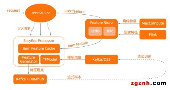 PAI-REC在線推理鏈路如圖2所示,其中EasyRec Processor負(fù)責(zé)模型推理環(huán)節(jié)。EasyRec Processor包含ItemFeatureCache, Feature Generator(特征交叉)和TF Model Serving三個(gè)部分,并能夠從Kafka/OSS獲取模型的增量更新,從FeatureStore獲取特征的實(shí)時(shí)更新。