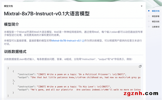 快速開(kāi)始(PAI-QuickStart)集成了國(guó)內(nèi)外AI開(kāi)源社區(qū)中優(yōu)質(zhì)的預(yù)訓(xùn)練模型,支持零代碼或是SDK的方式實(shí)現(xiàn)微調(diào)和部署Mixtral 8x7B MOE大模型,用戶只需要格式準(zhǔn)備訓(xùn)練集和驗(yàn)證集,填寫(xiě)訓(xùn)練時(shí)候使用的超參數(shù)就可以一鍵拉起訓(xùn)練任務(wù)。Mixtral的模型卡片如下圖所示: