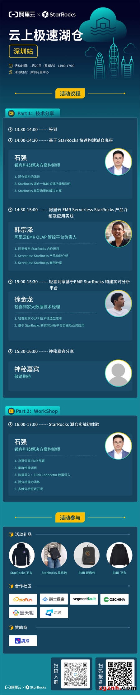 新年伊始,阿里云 EMR OLAP 團(tuán)隊(duì)與 StarRocks 社區(qū)聯(lián)合共赴深圳,鏡舟科技、阿里云 EMR、輕喜到家等行業(yè)專(zhuān)家共話云上 StarRocks,共同開(kāi)啟新一年的數(shù)據(jù)分析之旅!本次活動(dòng)的實(shí)操部分將會(huì)利用 EMR Serverless StarRocks 環(huán)境進(jìn)行演練,想從 0-1 快速利用 StarRocks 進(jìn)行湖上分析的小伙伴們請(qǐng)盡快報(bào)名~