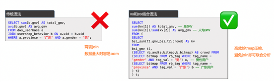 若要計(jì)算出“廣東、男用戶的GMV總和”,傳統(tǒng)的Join語(yǔ)法,數(shù)據(jù)量大時(shí)容易OOM,通過(guò)高效bitmap壓縮,避免join即可聯(lián)合分析。