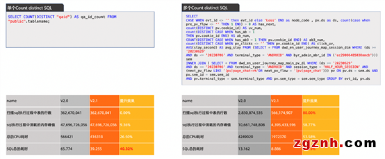 對(duì)比V2.1與V2.0版本,V2.1在單條及多條Count Distinct的內(nèi)存消耗、CPU使用、耗時(shí)上都有顯著差異。