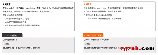 Hologres從V2.1版本開始,針對(duì)Count Distinct場(chǎng)景做了非常多的性能優(yōu)化(包括單個(gè)Count Distinct、多個(gè)Count Distinct、數(shù)據(jù)傾斜、SQL沒有Group By字段等場(chǎng)景),無(wú)需手動(dòng)改寫成UNIQ,即可實(shí)現(xiàn)更好的性能。