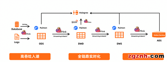 Flink +Paimon+ Hologres 實(shí)時(shí)湖倉(cāng)?;贔link將數(shù)倉(cāng)以Paimon這種 Table Format 形式在湖上構(gòu)建,上層可以使用 Flink進(jìn)行流計(jì)算,使用 Hologres 對(duì)所有層次做統(tǒng)一的OLAP查詢或者是最上面的ADS層做在線分析。方案中Paimon可以實(shí)現(xiàn)高吞吐的入湖,F(xiàn)link 可以實(shí)現(xiàn)全鏈路的實(shí)時(shí)計(jì)算,Hologres 可以實(shí)現(xiàn)高性能的OLAP查詢,所以整個(gè)鏈路從實(shí)時(shí)性、時(shí)效性、成本幾個(gè)方面都可以取的比較好的平衡。