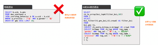 若要計(jì)算出“昨日廣東男用戶消費(fèi)金額Top K”,傳統(tǒng)語(yǔ)法對(duì)GMV排序要消耗大量資源,BSI+RB自帶TopK函數(shù),分析更高效。