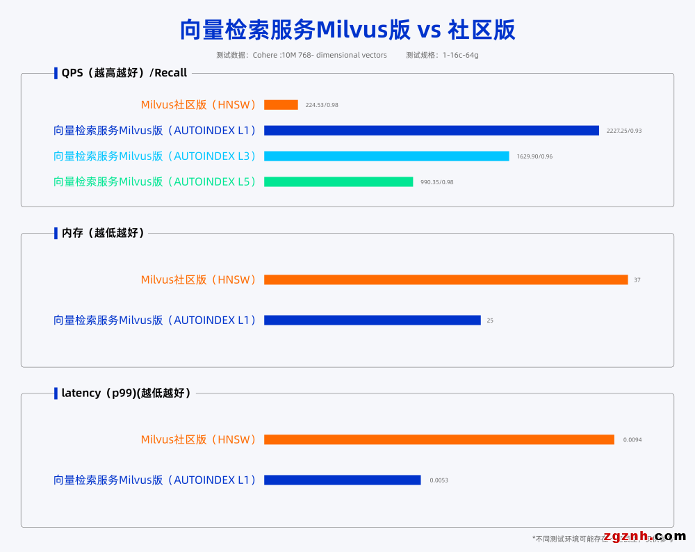 向量檢索服務(wù)Milvus版通過技術(shù)上的存算優(yōu)化,較Milvus社區(qū)版有著數(shù)倍的性能提升。具有Cardinal商業(yè)內(nèi)核,整合了最實用、最流行的 ANNS 方法,具備高效的計算資源使用率,通過大量可調(diào)整參數(shù)適配多種場景,能夠默認(rèn)自動調(diào)整參數(shù)適配不同的場景,在保持合理精度(召回率)的同時最大化搜索速度(QPS,每秒查詢數(shù))。體現(xiàn)在向量檢索中的索引類型上,向量檢索服務(wù)Milvus版提供功能更強大AUTOINDEX索引,對比HNSW、IVF等開源索引,用戶無需再花費時間精力調(diào)優(yōu)索引參數(shù),AUTOINDEX索引可以自適應(yīng)優(yōu)化索引參數(shù),一種索引適配多種場景,用戶只需聚焦于業(yè)務(wù)本身,減輕調(diào)參壓力。同時,提供遠超開源內(nèi)核的高性能的 ANN 算法、稀疏查詢算法等能力。在工程上進行了大量優(yōu)化,相同場景下引擎性能(QPS)是開源社區(qū)版的10倍,召回率一致的情況下QPS有5倍提升,而綜合考慮QPS和召回率也可實現(xiàn)8倍的提升。同時對計算、存儲資源進一步降低,可達到至少30%的自建Milvus上云成本縮減。通過開源向量數(shù)據(jù)庫性能測試工具對向量檢索服務(wù)Milvus版和社區(qū)版進行評估測試,結(jié)果如下: