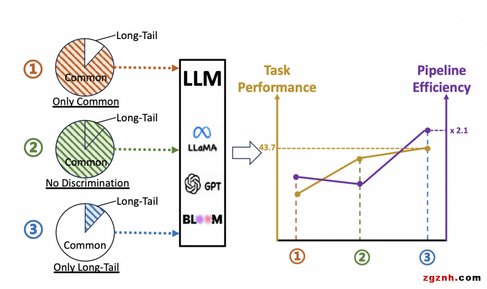 具體來(lái)說(shuō),pred和ref分別表示生成的文本和模型任務(wù)的標(biāo)準(zhǔn)結(jié)果。M(pred, ref)是模型對(duì)應(yīng)的METEOR score度量結(jié)果。平均token概率中的P(ti)表示由LLM產(chǎn)生的第i個(gè)token的概率,n是token序列長(zhǎng)度。對(duì)于分母部分,α是平均詞頻。我們可以看到,長(zhǎng)尾實(shí)例的α值較小,因此其倒數(shù)將較大。另外,▽ins是當(dāng)前實(shí)例的梯度,E(▽ins)是整個(gè)數(shù)據(jù)集的平均梯度。為了獲得梯度,我們僅通過(guò)使用數(shù)據(jù)集微調(diào)LLM來(lái)運(yùn)行前向和后向梯度傳遞。我們可以看到,與數(shù)據(jù)集的平均得分相比,長(zhǎng)尾實(shí)例具有更小的梯度▽ins,從而獲得更小的點(diǎn)積E(▽ins)·▽ins。