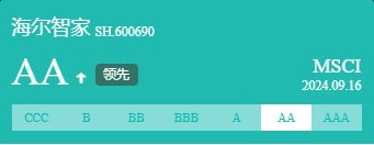 作為全球最大的ESG數(shù)據(jù)、研究和指數(shù)供應(yīng)商,MSCI深受全球投資機(jī)構(gòu)認(rèn)可,其ESG評(píng)級(jí)也是國內(nèi)外投資者制定投資策略、評(píng)估企業(yè)可持續(xù)發(fā)展能力的重要參考。據(jù)了解,MSCI ESG評(píng)級(jí)分為CCC、B、BB、BBB、A、AA、AAA七個(gè)評(píng)級(jí)。海爾智家的ESG評(píng)級(jí)持續(xù)上調(diào)至AA,說明其圍繞綠色發(fā)展、社會(huì)責(zé)任以及公司治理等方面的實(shí)踐備受外界認(rèn)可。