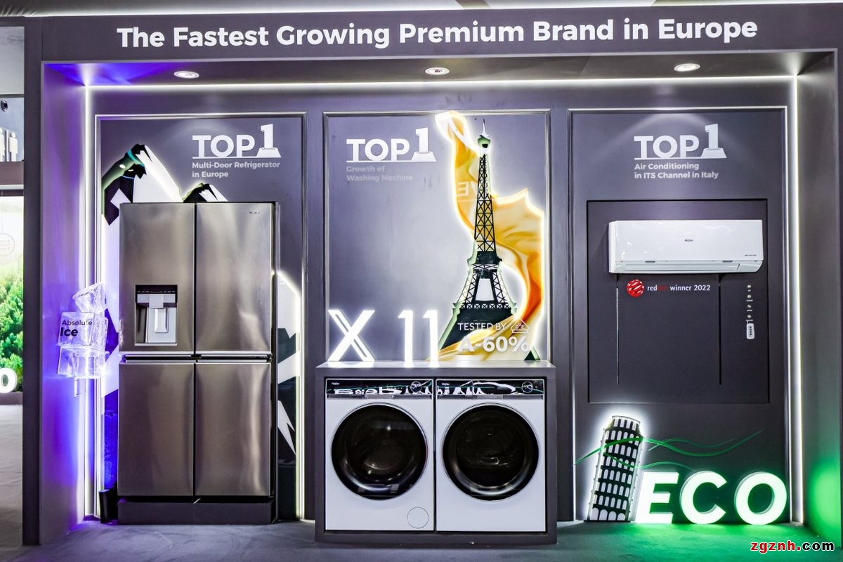 再往前走,來到歐洲市場區(qū)域,可以看到“海爾多門冰箱歐洲TOP1”的市場地位,以及當(dāng)下正在熱賣的能夠潔凈制冰的冰箱。這款冰箱首創(chuàng)三系統(tǒng)制冷形成差異化優(yōu)勢,制冰、冷藏和冷凍均為獨(dú)立制冷系統(tǒng),實(shí)現(xiàn)10倍潔凈度,為用戶飲用潔凈冰提供了方案。在這個(gè)展區(qū)里,還能看到X11系列洗干組合洗衣機(jī),其中X11洗衣機(jī)比歐洲A級(jí)能效標(biāo)準(zhǔn)還節(jié)能60%,是全球最節(jié)能的洗衣機(jī);而干衣機(jī)能效也比A+++還節(jié)能25%。