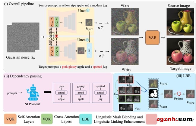 在本文中,我們提出了 VICTORIA 編輯算法,它利用語言知識來解決在對象場景編輯中因缺失目標(biāo)(如對象、屬性和背景)而導(dǎo)致的問題。VICTORIA 通過分析輸入編輯文本中單詞之間的依存關(guān)系,并將這種關(guān)系反映在注意層的中間表示中,從而修正并生成目標(biāo)圖像。圖2展示了 VICTORIA 的整體框架。首先,我們通過控制自注意機(jī)制來確保原始圖像和編輯后圖像之間的空間一致性。其次,VICTORIA 分析輸入編輯文本中單詞之間的依存關(guān)系,并在生成目標(biāo)編輯圖像的過程中主動干預(yù)交叉注意力圖,從而提升目標(biāo)編輯區(qū)域的生成結(jié)果。最后,VICTORIA 通過交叉注意圖進(jìn)行圖像部分掩碼,有效保留原始圖像中無需被編輯的區(qū)域。