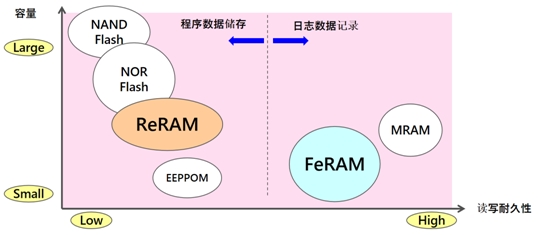 FeRAM依賴鐵電材料的獨特性質進行數據存儲。該類存儲器以其超快的讀寫速度、出色的寫入耐久性以及較低的功耗特性而著稱。FeRAM的讀寫速度是納秒級,遠超過NOR flash、EEPROM;讀寫次數達到10141013,在某種意義上相當于無限次,EEPROM、NOR Flash一般都有次數的限制?;谶@兩個特點,在實時寫入、掉電保護等、需要讀寫次數比較高的快速非易失性存儲的應用場景中(如智能卡、計量設備以及汽車中的事件數據記錄儀),FeRAM有著不可替代的絕對優(yōu)勢。同時,FeRAM也可以替換EEPROM、SARM以及MRAM