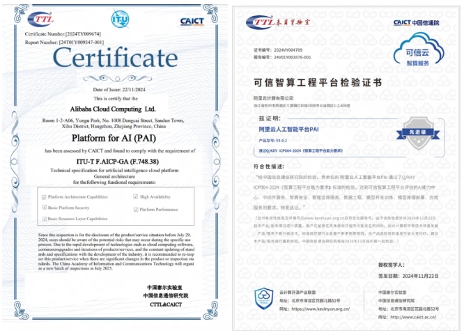 近日,阿里云人工智能平臺(tái) PAI 順利通過(guò)中國(guó)信通院組織的 ITU-T AICP-GA(Technical Specification for Artificial Intelligence Cloud Platform:General Architecture)國(guó)際標(biāo)準(zhǔn)和《智算工程平臺(tái)能力要求》國(guó)內(nèi)標(biāo)準(zhǔn)一致性測(cè)評(píng),成為國(guó)內(nèi)首家通過(guò)該標(biāo)準(zhǔn)的企業(yè)。阿里云人工智能平臺(tái) PAI 參與完成了智算安全、AI 能力中心、數(shù)據(jù)工程、模型開(kāi)發(fā)訓(xùn)練、模型推理部署等全部八個(gè)能力域,共計(jì)220余個(gè)用例的測(cè)試,并100%通過(guò)測(cè)試要求,獲得了 ITU 國(guó)際標(biāo)準(zhǔn)和國(guó)內(nèi)可信云標(biāo)準(zhǔn)評(píng)估通過(guò)雙證書(shū)。