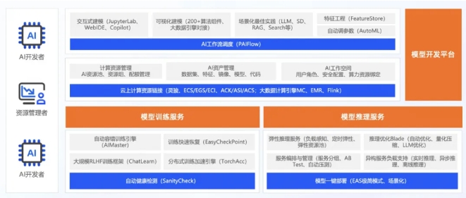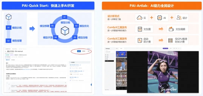 阿里云人工智能平臺(tái) PAI(Platform for AI)是面向企業(yè)客戶(hù)及開(kāi)發(fā)者的一站式 AI 平臺(tái),提供模型開(kāi)發(fā)平臺(tái)、模型訓(xùn)練服務(wù)、以及模型推理服務(wù),包括 PAI-iTag 智能標(biāo)注、PAI-FeatureStore 特征存儲(chǔ)、PAI-DSW 交互式建模、PAI-Designer 可視化建模、PAI-DLC 分布式訓(xùn)練、以及 PAI-EAS 在線部署、PAI-Blade 推理加速等功能模塊,涵蓋 AI 開(kāi)發(fā)的完整流程。PAI 還提供場(chǎng)景化最佳實(shí)踐 QuickStart 和行業(yè)領(lǐng)域 AIGC 工具 ArtLab。