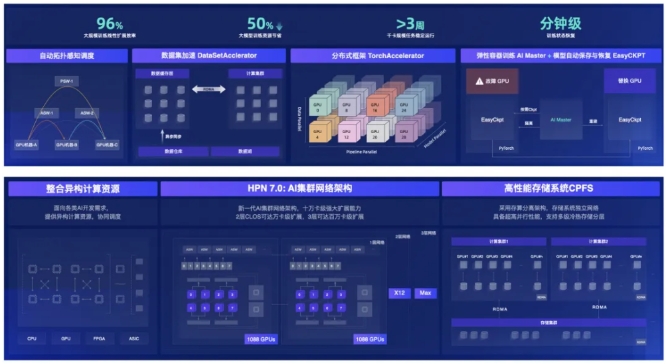 自研的容錯(cuò)引擎 AIMaster、高性能 Checkpoint 框架 EasyCKPT、健康檢測(cè) SanityCheck 以及節(jié)點(diǎn)自愈功能,有效解決多種穩(wěn)定性問(wèn)題。具備快速探查、準(zhǔn)確感應(yīng)與快速反饋的能力,有效降低算力損失,提升訓(xùn)練穩(wěn)定性。