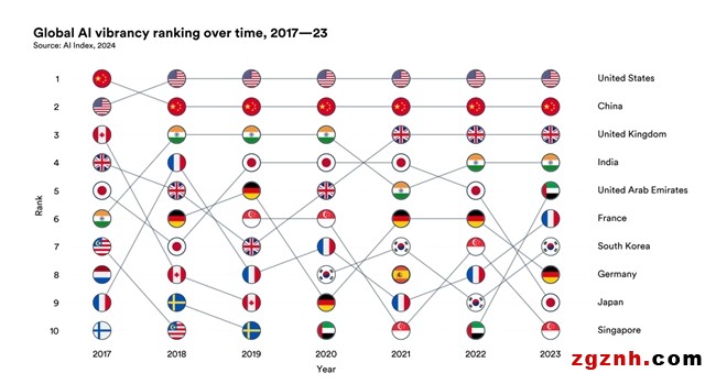 圖源:斯坦福人類中心人工智能研究所發(fā)布的“全球人工智能活力排名(2024)”
