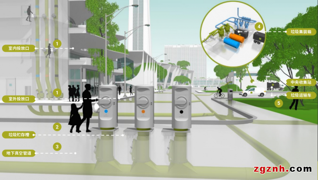 針對(duì)城市社區(qū)、公共區(qū)域等場(chǎng)景,系統(tǒng)通過(guò)投放口、真空傳輸管道與收集中心的高效協(xié)同實(shí)現(xiàn)垃圾收運(yùn)。投放口支持刷卡、人臉識(shí)別等無(wú)接觸操作滿足分類需求。傳輸管道利用真空負(fù)壓技術(shù),以70-80公里/小時(shí)的速度輸送垃圾,最大覆蓋半徑達(dá)2公里;收集中心通過(guò)壓縮、存儲(chǔ)等工序集中處理垃圾,最終由專用設(shè)備密閉運(yùn)輸。