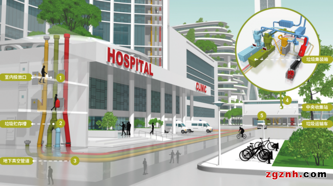 醫(yī)療領(lǐng)域是恩華特系統(tǒng)的特色應(yīng)用場(chǎng)景。針對(duì)醫(yī)院污衣被服及醫(yī)療垃圾的特殊處理需求,系統(tǒng)設(shè)置了專屬投放口:垃圾及污衣被服分類投入后,在風(fēng)機(jī)驅(qū)動(dòng)下以70km/h速度抽運(yùn)至中央收集站。其中,垃圾被集中收納至專用集裝箱,由環(huán)衛(wèi)車轉(zhuǎn)運(yùn)處理;污衣被服則直接輸送至洗衣房,進(jìn)入清洗消毒流程。