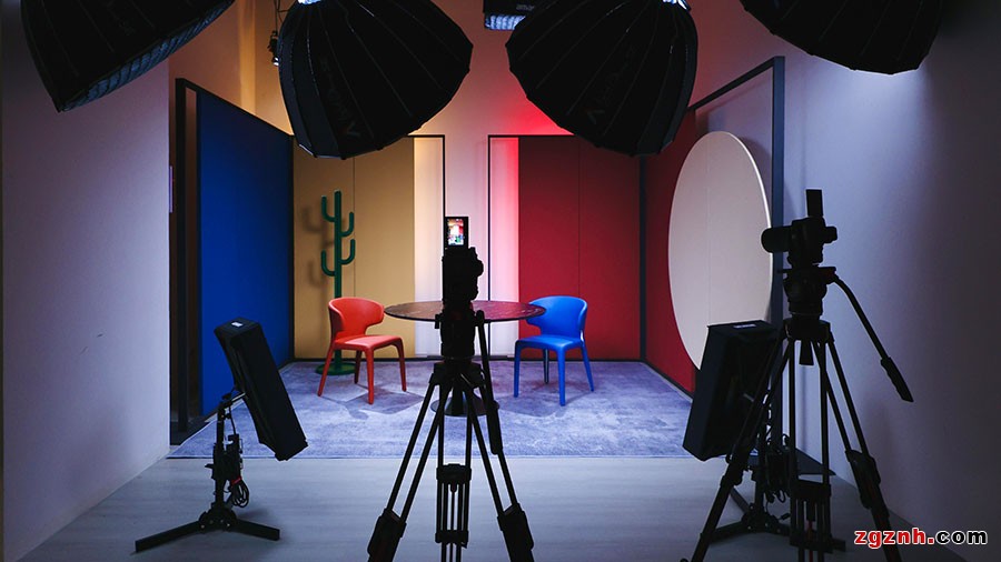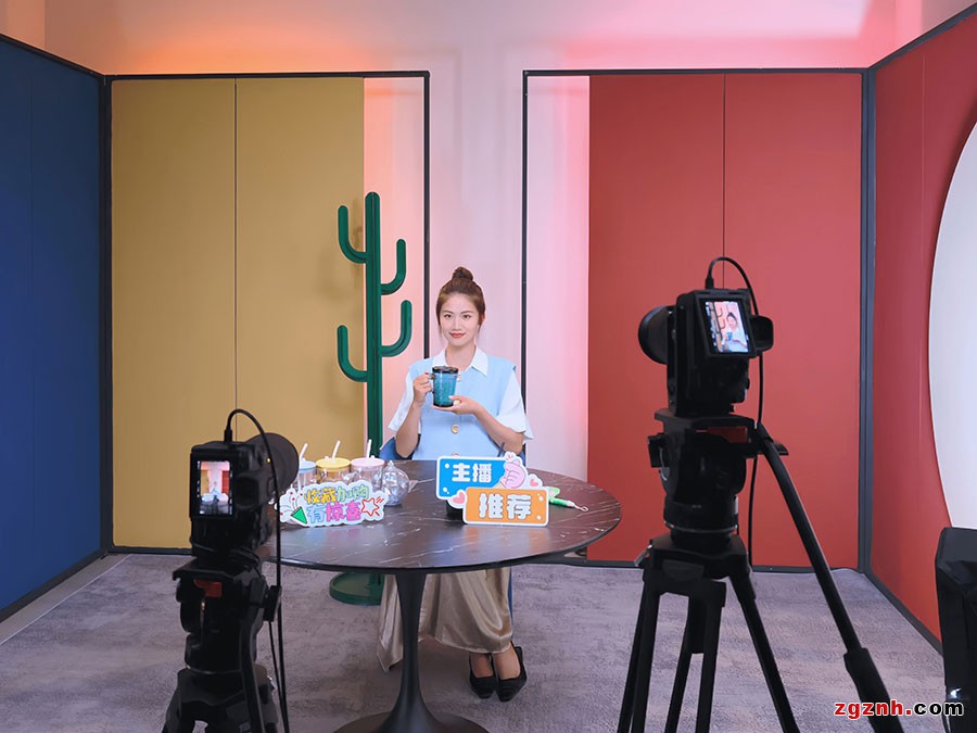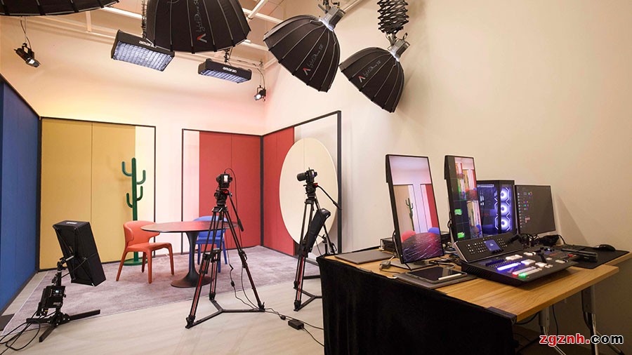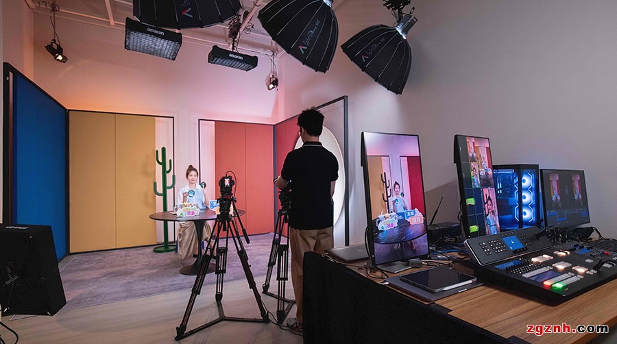 場(chǎng)景設(shè)計(jì):選用品牌色系的輕量化材質(zhì),采用吊頂方鋼提升空間利用率,同步優(yōu)化聲學(xué)環(huán)境,打造專業(yè)影棚質(zhì)感;