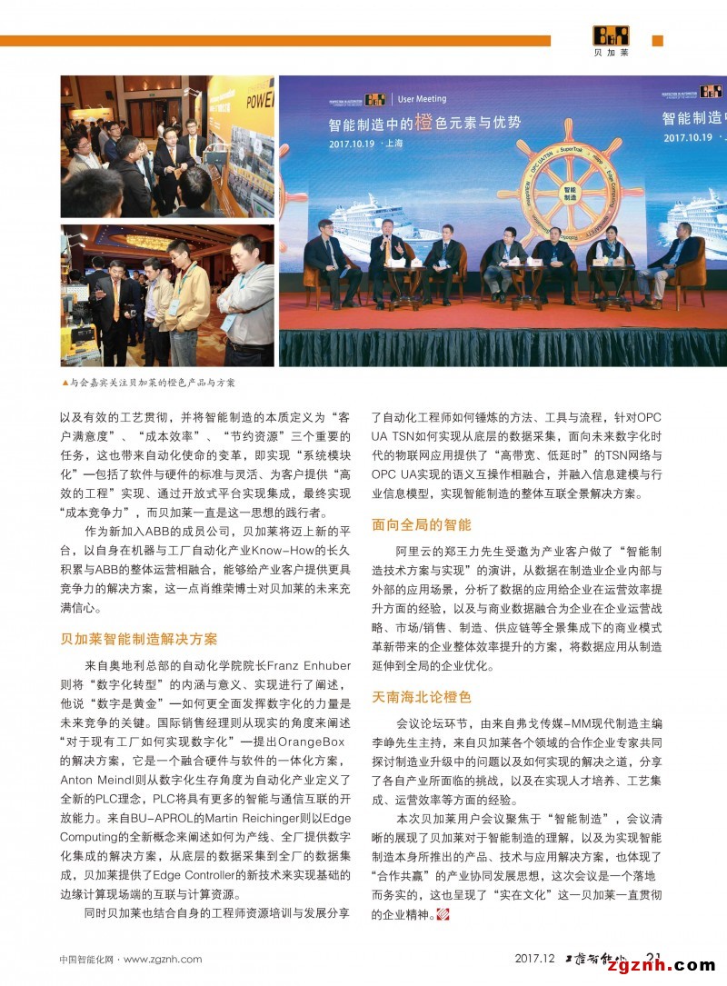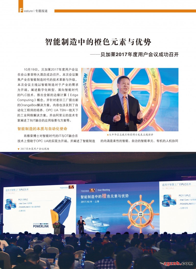 10月19日,貝加萊2017年度用戶會(huì)議在佘山索菲特大酒店成功召開,本次會(huì)議聚焦產(chǎn)業(yè)在智能制造時(shí)代的技術(shù)革新與升級(jí),本次會(huì)議主線以智能制造對(duì)于產(chǎn)業(yè)的需求為開端,闡述數(shù)字化轉(zhuǎn)型、面向智能時(shí)代的PLC技術(shù)、推出全新的邊緣計(jì)算(Edge Computing)概念,并針對(duì)老舊工廠提出新的OrangeBox解決方案,內(nèi)容也涉及到了自動(dòng)化工程師的培養(yǎng)、OPC UA TSN一統(tǒng)天下的工業(yè)網(wǎng)絡(luò)解決方案,并由阿里云的技術(shù)專家闡述了向IT融合的應(yīng)用場(chǎng)景與方案等。