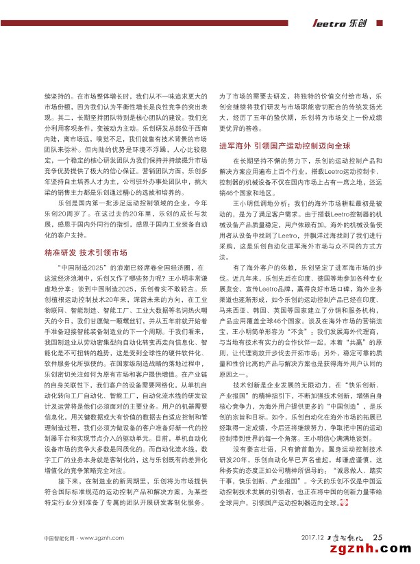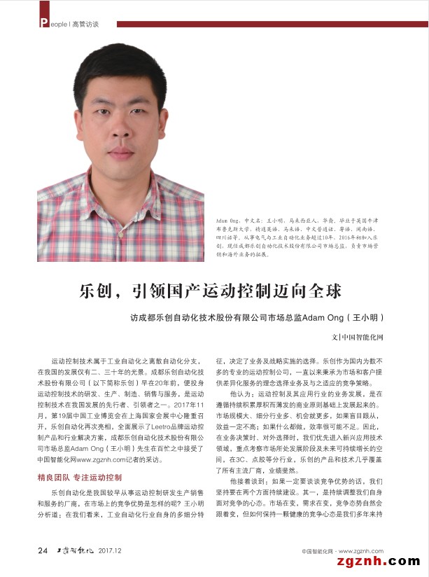 運(yùn)動控制技術(shù)屬于工業(yè)自動化之離散自動化分支,在我國的發(fā)展僅有二、三十年的光景。成都樂創(chuàng)自動化技術(shù)股份有限公司(以下簡稱樂創(chuàng))早在20年前,便投身運(yùn)動控制技術(shù)的研發(fā)、生產(chǎn)、制造、銷售與服務(wù),是運(yùn)動控制技術(shù)在我國發(fā)展的先行者、引領(lǐng)者之一。2017年11月,第19屆中國工業(yè)博覽會在上海國家會展中心隆重召開,樂創(chuàng)自動化再次亮相,全面展示了Leetro品牌運(yùn)動控制產(chǎn)品和行業(yè)解決方案,成都樂創(chuàng)自動化技術(shù)股份有限公司市場總監(jiān)Adam Ong(王小明)先生在百忙之中接受了中國智能化網(wǎng)m.zgmsyjy.com記者的采訪。